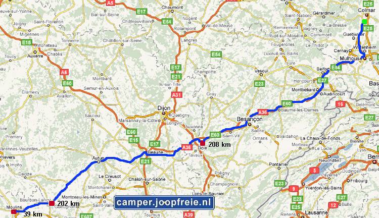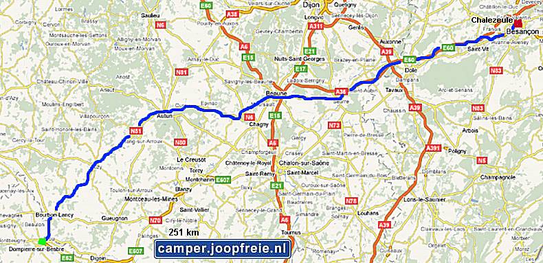 langs de rivier de Doubs rijdt. Vanaf Besançon gaat het over de N73 naar Dôle. Om 4 uur en met 208 km op de teller komen we